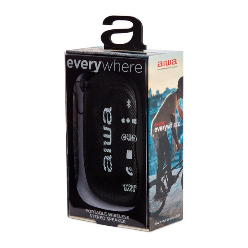 Prenosný reproduktor Aiwa BS-110BK v elegantnej čiernej farbe sa stane vašim oddaným hudobným spoločníkom. Môžete si ho vziať so sebou v podstate kamkoľvek, pretože je vybavený pútkom na karabínu, pričom samotnú hliníkovú karabínu nájdete medzi príslušenstvom. K ľahkému prenášaniu prispievajú aj kompaktné rozmery reproduktora a jeho Soft Touch štýlový dizajn. So svojim smart/inteligentným telefónom či napríklad tabletom prepojíte reproduktor prostredníctvom Bluetooth, určite vás poteší kompatibilita s iOS, Android aj Windows. Keď vám Aiwa BS-110BK nebude práve vyhrávať, možno ho využiť na telefonovanie, súčasťou jeho výbavy je totiž handsfree so vstavaným mikrofónom.