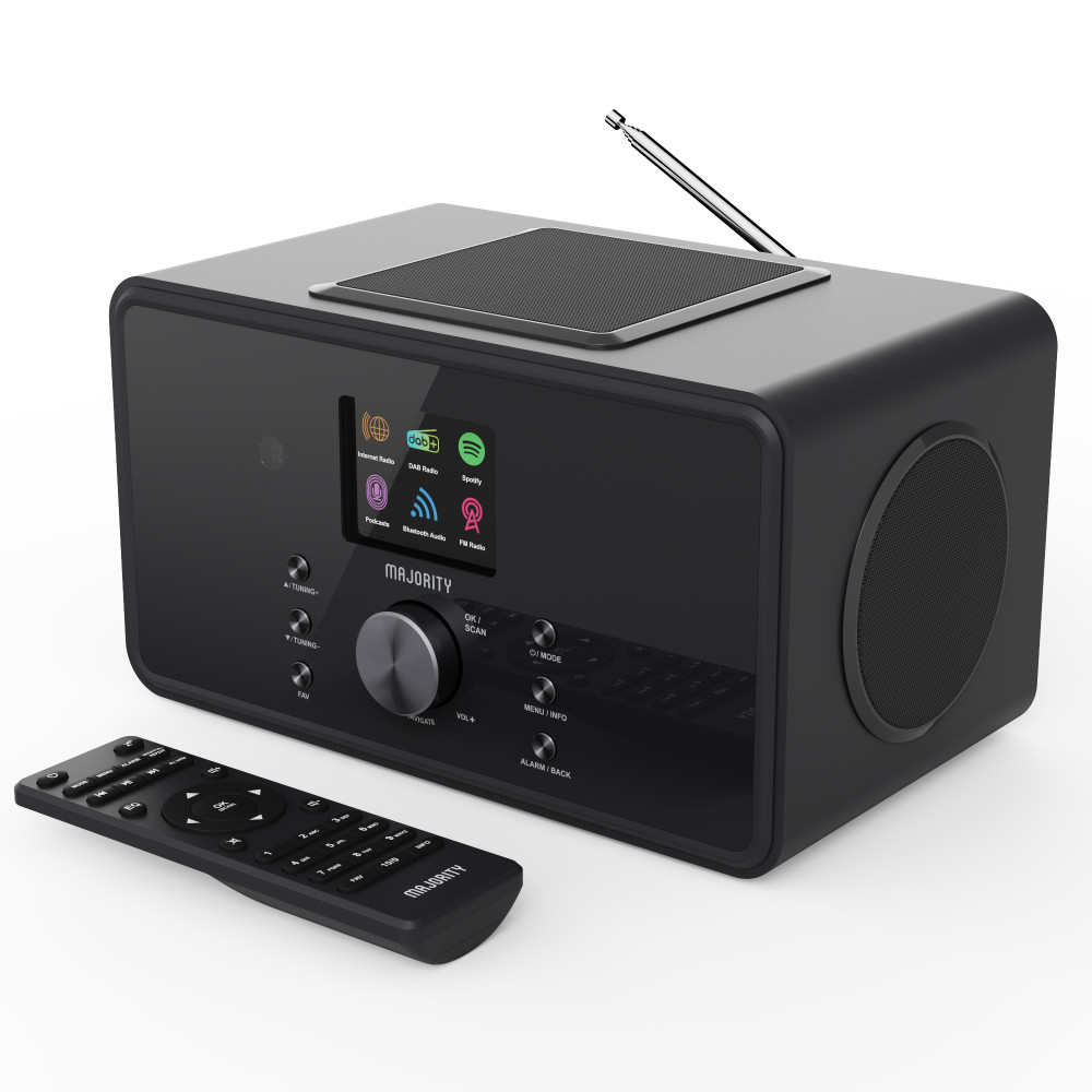 Majority Bard Black je všestranné digitálne rádio, ktoré kombinuje moderné funkcie s klasickým dizajnom. V jednom kompaktnom zariadení získavaš internetové rádio, DAB+ a FM tuner, budík s funkciami sleep a snooze, Bluetooth prehrávanie, Wi-Fi pripojenie aj Spotify Connect.