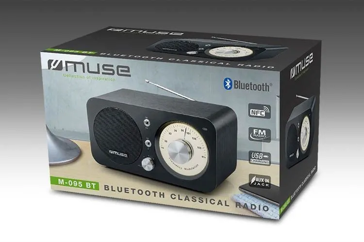 Prenosný rádioprijímač Muse M-095 BT v čiernom retro dizajne vás prekvapí množstvom praktických funkcií. Prostredníctvom Bluetooth technológie vám umožní streamovať hudbu z vášho smartfónu či tabletu s dosahom až 10 m. O prísun obľúbeného rozhlasového vysielania sa postará FM rádio, no ak si budete chcieť prehrať playlist uložený na externom zariadení, môžete ho pripojiť cez Aux-In. Zariadenie disponuje teleskopickou anténou FM, rotačným ovládaním hlasitosti, osvetlením stupnice vytáčania a nabíjacím USB portom.