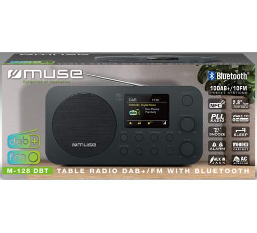 Moderný rádioprijímač Muse M-128 DBT v čiernom prevedení vďaka svojim kompaktným rozmerom a minimalistickému dizajnu poľahky zapasuje do každej izby vo vašej domácnosti. Špecifikom sú DAB/DAB+ a FM PLL tunery s možnosťou uloženia 20 predvolených staníc (10 FM + 10 DAB), ktoré vám umožnia vychutnať si obľúbené rozhlasové vysielanie, technológia Bluetooth, pre streamovanie hudby zo smartfónu či tabletu, NFC (funkcia automatického párovania) a prehľadný 2,8“ (7 cm) TFT LCD displej, na ktorom sa zobrazia všetky dôležité informácie. Zariadenie disponuje výstupným výkonom 5 W, Aux-In jack konektorom a duálnym alarmom (budenie rádiom, bzučiakom, rozhraním Bluetooth), pri ktorom nechýbajú ani funkcie Sleep a Snooze.