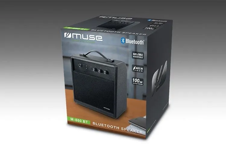 Štýlový bezdrôtový reproduktor Muse M-660 BT v čiernom farebnom prevedení vás svojím dizajnom pripomínajúcim repráky, ktoré nájdete na hudobných koncertoch, s určitosťou očarí. Na prednej strane sa nachádza mriežka ochraňujúca vnútro prístroja, z ktorého poplynú tóny vašich obľúbených skladieb so špičkovým výkonom 100 W. Svoje playlisty budete môcť streamovať zo smartfónov či tabletov prostredníctvom Bluetooth v4.0, ale na pripojenie externého zariadenia s hudbou poslúži aj vstup Aux-In. Zariadenie poskytuje možnosti nastavenia výšok, basov a hlasitosti a na jednoduchý transport poslúži praktické držadlo. Napájanie je zabezpečené cez 230 V s odpojiteľným napájacím káblom.