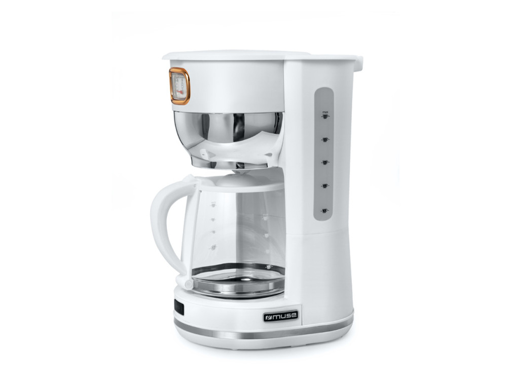 MUSE MS-220W je elegantný a kompaktný prekvapkávací kávovar, ideálny na každodennú prípravu filtrovanej kávy doma alebo v kancelárii. Zariadenie je vybavené sklenenou kanvicou s objemom 0,6 litra, čo zodpovedá príprave približne 5 šálok kávy naraz.