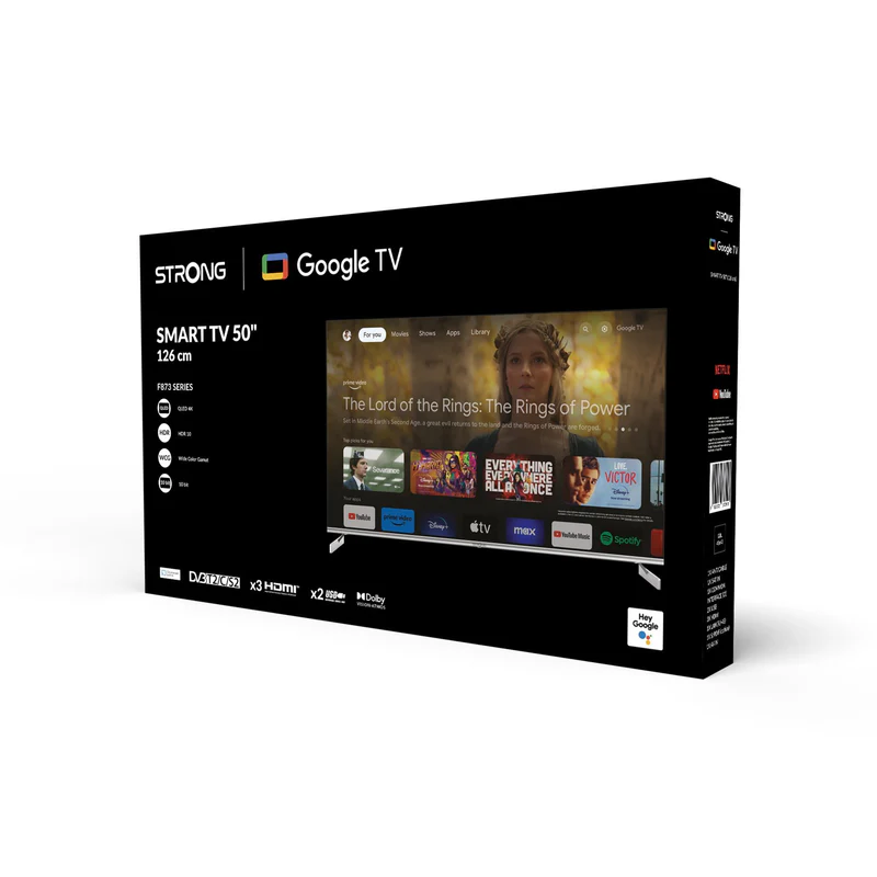 Radi by ste si doma užili filmy v rovnakej kvalite ako v kine? V tom prípade si zaslúži vašu pozornosť televízor STRONG. Nechajte sa okúzliť neuveriteľnými vizuálnymi zážitkami vďaka technológii QLED a podporovaným formátom HDR10 a Dolby Vision. Preferované filmy a seriály z najobľúbenejších služieb ako je YouTube, NETFLIX či Voyo, vás úplne pohltia. Veľmi nadšení budú aj fanúšikovia dynamických scén vďaka 50 / 60Hz obnovovacej frekvencii panela. Cloud gaming spoločne s odozvou 6,5 ms uspokojí aj tých najnáročnejších herných fanúšikov. Brilantný obraz sprevádza aj ohromujúci zvuk pod taktovkou 20W reproduktorov. Smart TV STRONG využíva novodobú technológiu operačného systému Google TV a jeho vydarený dizajn dolaďuje vskutku elegantné vyhotovenie. K zaujímavému stvárneniu prispieva strieborná farba. Televízor môžete pripevniť na stenu za pomoci držiaka VESA s rozmermi 200×200 mm. Diaľkový ovládač je súčasťou balenia. Pohodlne sa usaďte a užite si detailné 4K Ultra HD rozlíšenie na 50" uhlopriečke. Televízor STRONG je schopný zásluhou veľkého množstva pixelov po celej ploche obrazovky sprostredkovať veľmi podrobný obraz. Označenie 4K predstavuje štyrikrát väčší počet zobrazovaných bodov v porovnaní s Full HD obrazovkou. Obraz sa skladá z 3840 × 2160 pixelov, to umožňuje prenášať všetky filmy a programy na obrazovku s výnimočnou ostrosťou a bez zníženia kvality. Technológia Direct LED vám ponúkne presné zónové podsvietenie, ktoré sa prispôsobuje obsahu obrazu a poskytuje najlepší kontrast a reprodukciu farieb. O riadenie podsvietenia v tmavých oblastiach sa stará funkcia lokálneho stmievania. Local dimmig tak prirodzene zníži jas bez toho, aby v dôsledku jasné oblasti výraznejšie utrpeli na kvalite