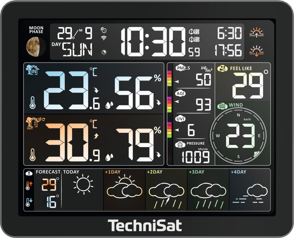 TechniSat IMETEO 800 je moderná digitálna meteostanica, ktorá poskytuje presné informácie o aktuálnych poveternostných podmienkach v interiéri aj exteriéri. Zariadenie zobrazuje vnútornú a vonkajšiu teplotu, vlhkosť vzduchu, predpoveď počasia, fázy Mesiaca, ako aj čas a dátum na prehľadnom farebnom LCD displeji.